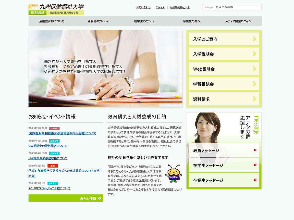 保育・教育 WORKS制作実績 お客様とのウェブ制作に関する契約上、実績の一部のみを紹介しています。 その他の制作実績については「お問い合わせ」よりご依頼いただければ、個別に対応させていただきます。 全て 行政・団体 医療・福祉 保育・教育 卸売・小売 サービス 製造・メーカー 動画 宮崎大学障がい学生支援室 九州保健福祉大学 宮崎大学農学部 応用生物科学科 植物遺伝育種学研究室 宮崎大学 産学・地域連携センター 九州保健福祉大学 通信教育部 宮崎県立農業大学校 宮崎大学医学部・大学院医科学看護学研究科 <12